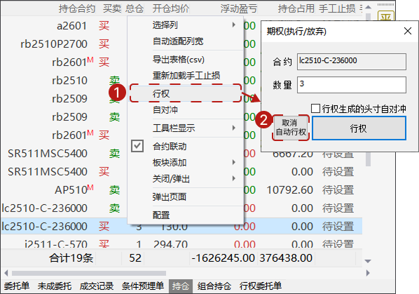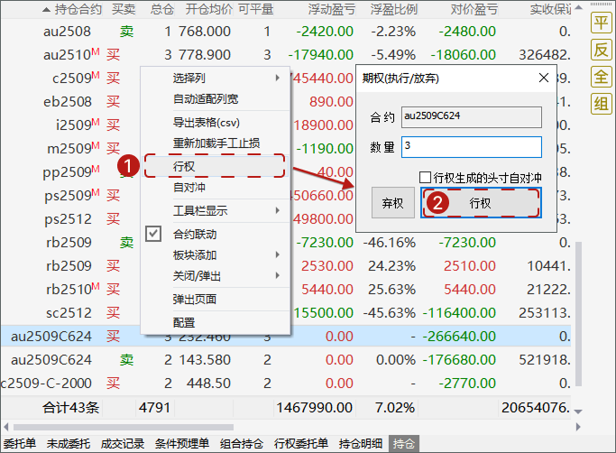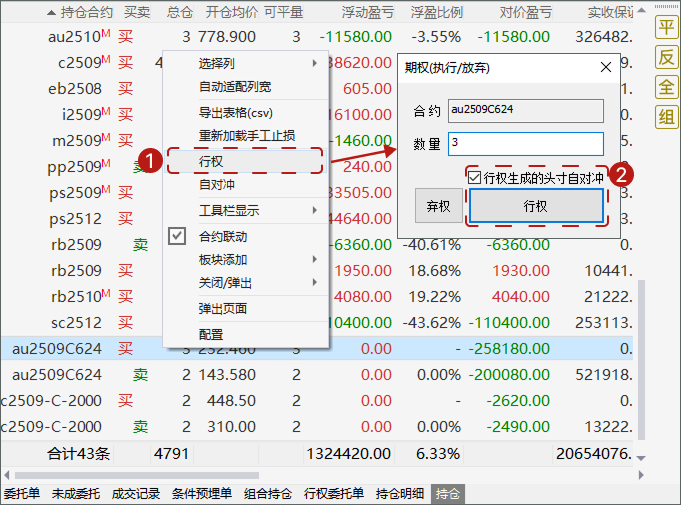 上期所、广期所操作方式:在持仓板块点击期权持仓,鼠标右键→行权→行权→勾选行权生成的头寸自对冲→行权。