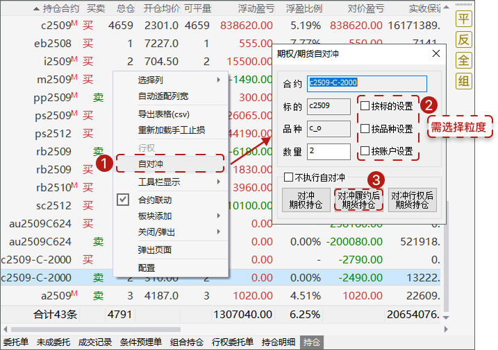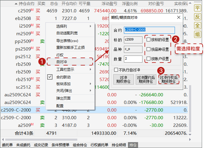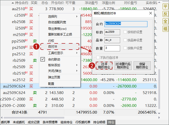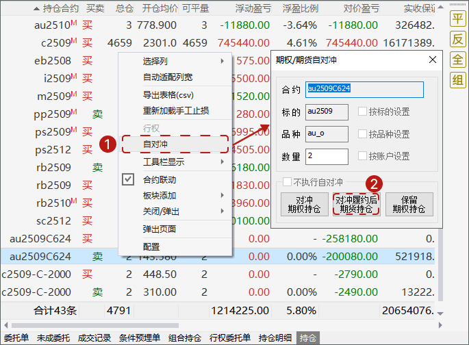 上期所、广期所操作方式:在持仓板块点击期权持仓,鼠标右键→自对冲→对冲期权持仓。