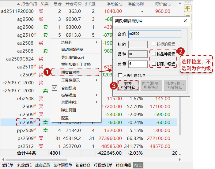 操作方式:在持仓板块点击期货持仓,鼠标右键→自对冲→选择指令粒度(品种/账户/不选则按合约)→对冲期货持仓。 若需设置不执行自对冲的范围,则勾选”不执行自对冲“。