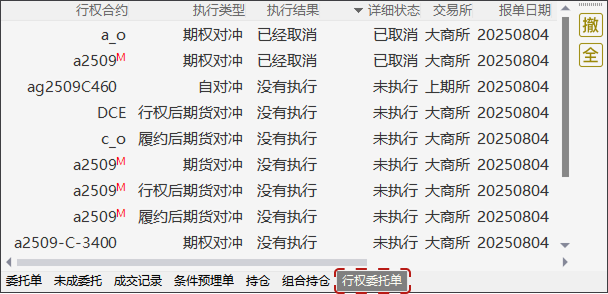 提供买方行权放弃指令,如果要放弃部分或者全部实值期权,则带入全部或者部分放弃数量,无单独取消自动行权指令。