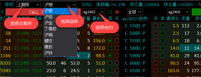 期权合约复杂繁多,我们可以通过【交易所 - 品种 - 合约】筛选方式,快速找到需要的合约。