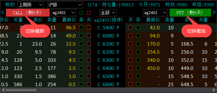 期权T型报价表由中间一列执行价和两侧数据组成,点击CALL/PUT标志可以快速切换两侧对应的看涨看跌期权。