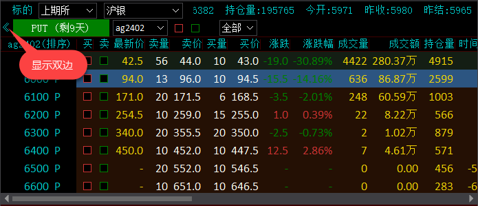 我们点击报价表的 ”《” 或 ”》”按钮切换单/双边数据显示模式。也可以在鼠标右键菜单栏的【显示模式】里修改。