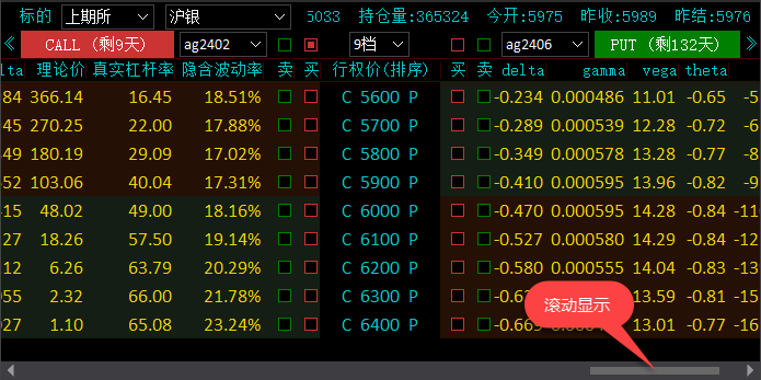 拖动板块下方的滑块,两侧期权列表会对称滚动显示相同数据列。如在鼠标右键菜单里取消勾选【对称滚动】功能,则不再同步显示数据,此时可使用滑块进行单边数据列滚动。