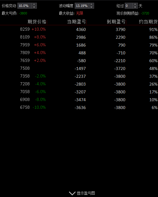 盈亏表显示期货价格在设定的价格变动下的当期盈亏,到期盈亏以及约当期货的详细数据。