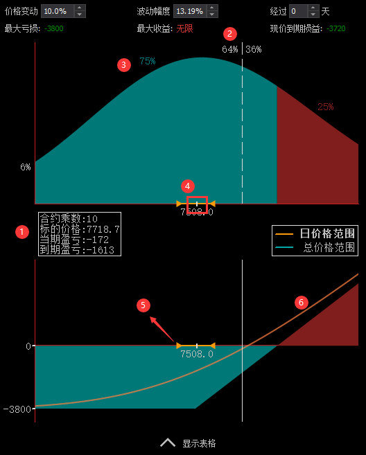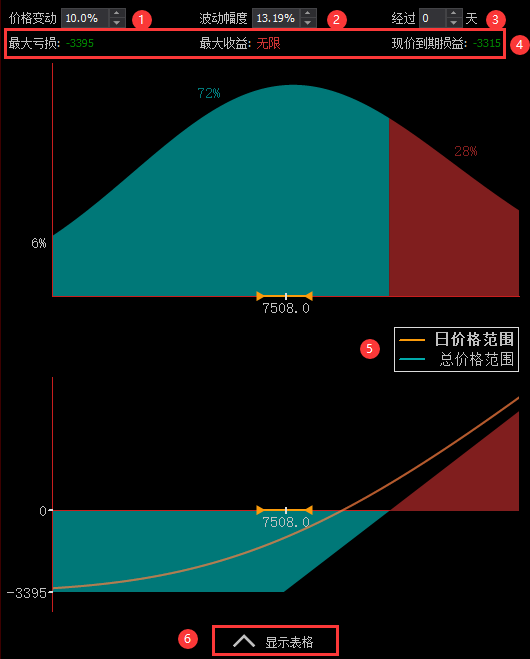 ①价格变动:盈亏概率图及盈亏表展示的价格浮动范围