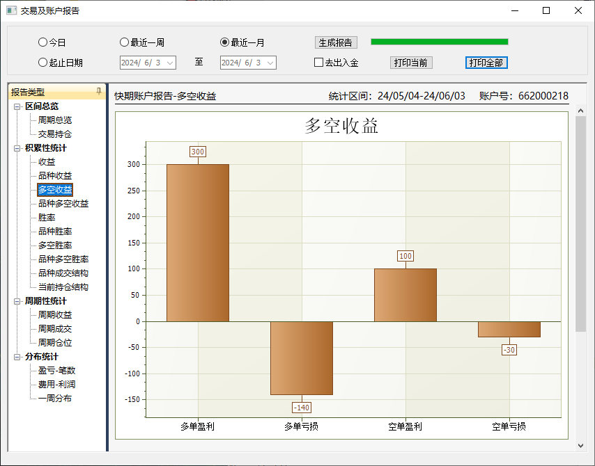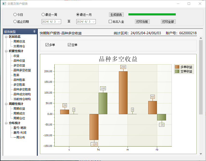 按不同品种的多单、空单分别统计收益情况。可以选择只看多单或只看空单的收益。