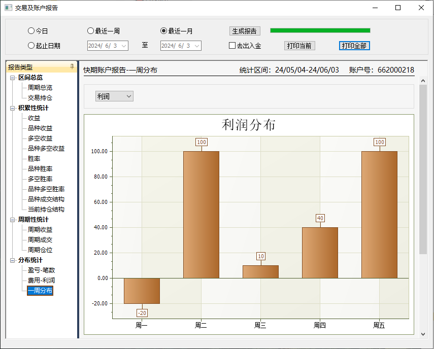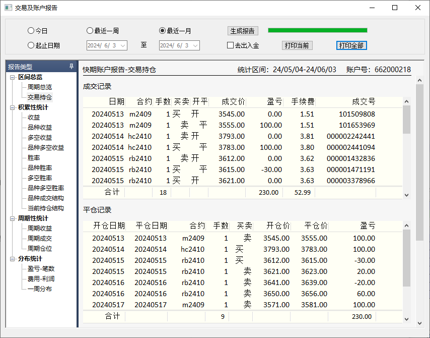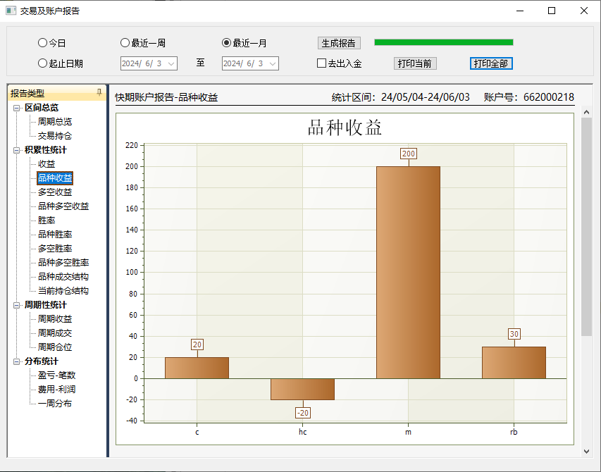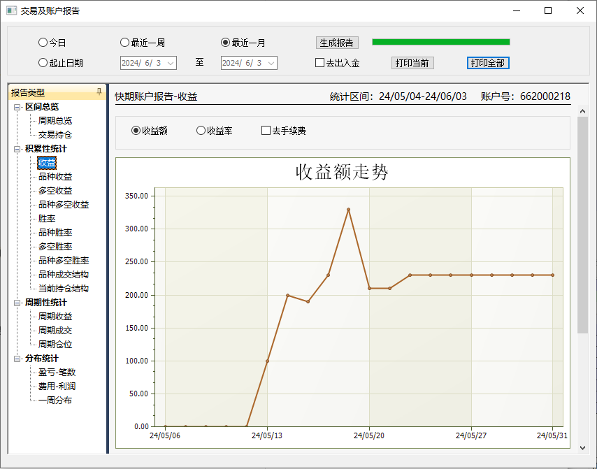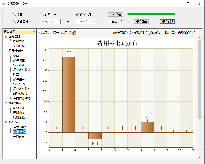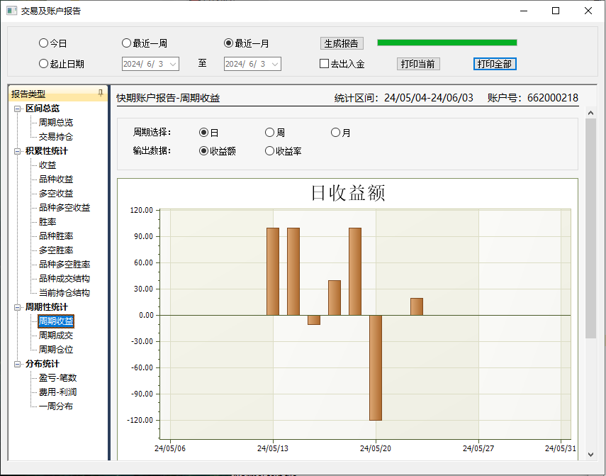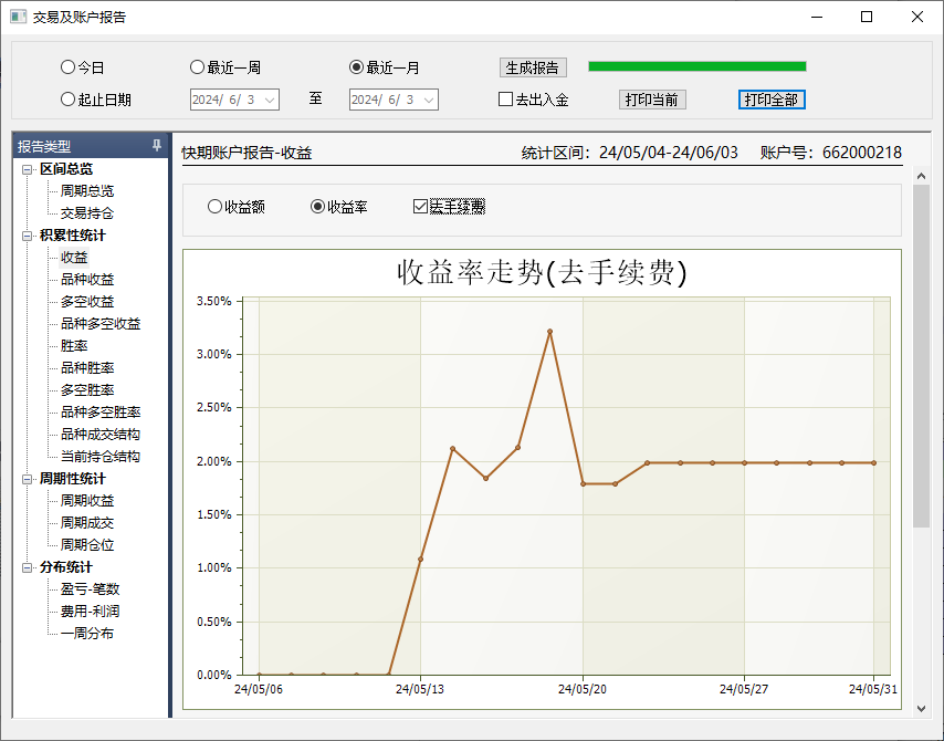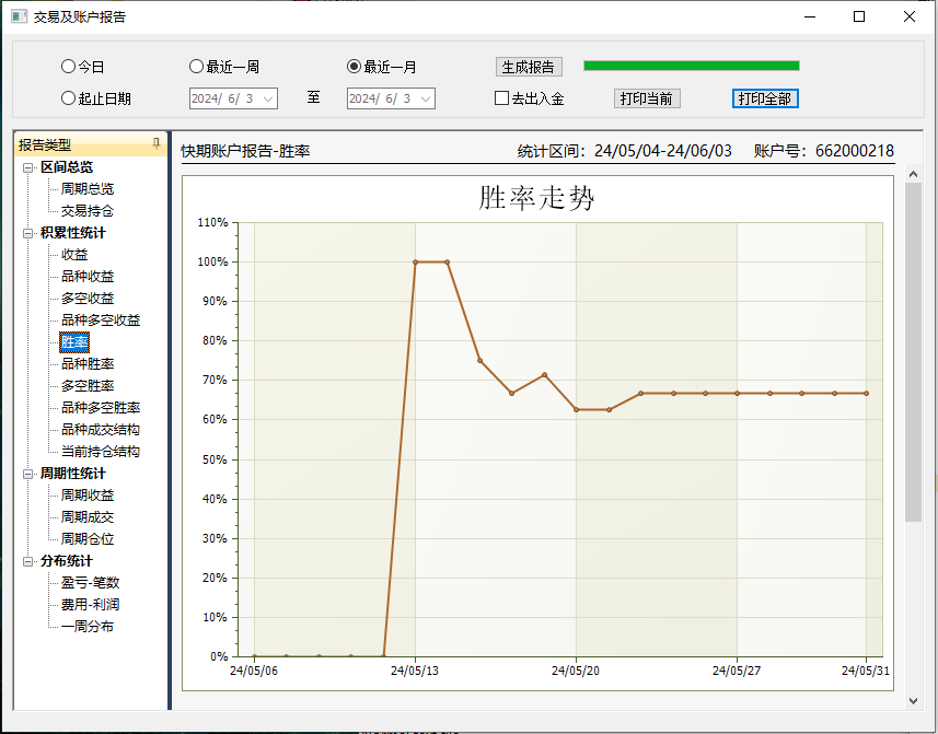快期3的报告功能提供全面的账户交易统计和收益分析,您能够使用它快速掌握自己的投资状况,优化投资策略并有效管理风险,进而做出更明智的交易决策。 可以自由设定报告的时间区间,以掌握账户在不同阶段的收益表现。
