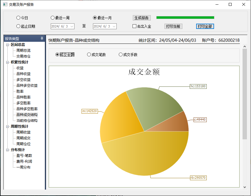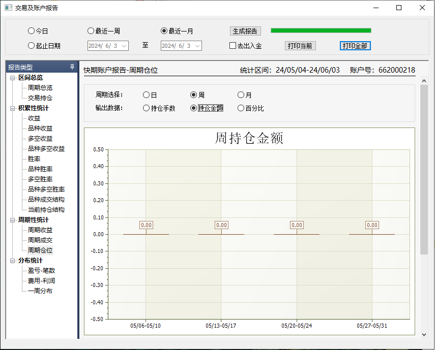 在本页面内可以按照日、周、月不同周期查看账号的持仓手数和持仓金额及百分比等统计情况。