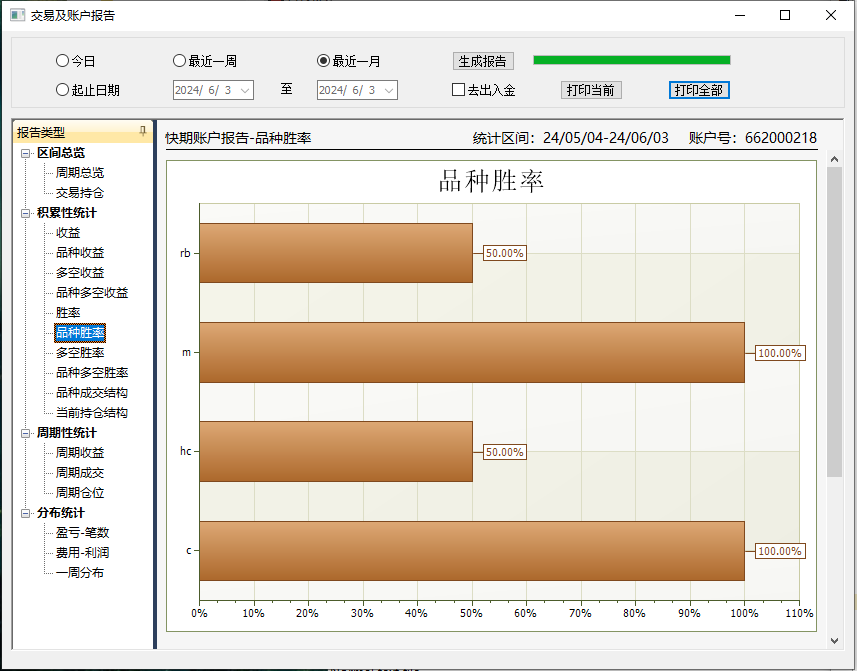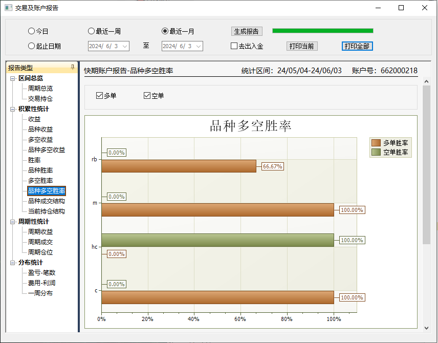 按不同品种的多单、空单分别统计胜率情况。可以选择只看多单或只看空单。