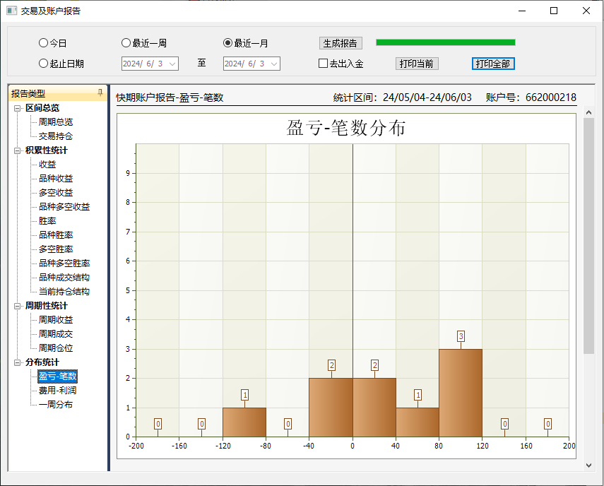 查看统计区间范围内不同盈亏额对应的笔数分布情况。