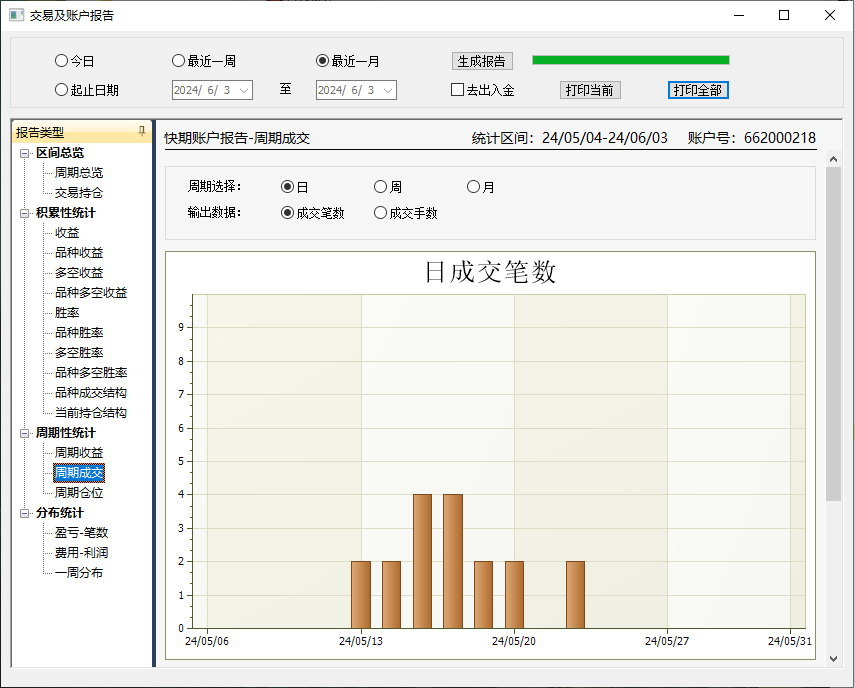 在本页面内可以按照日、周、月不同周期查看账号的成交笔数和成交手数统计情况。