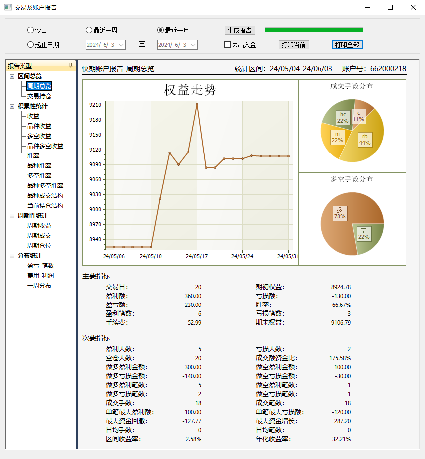 周期总览页面提供统计区间内的权益走势、成交手数分布、多空手数分布等整体情况图表,以及一些整体的指标数据,直观了解账户的资金和持仓情况。